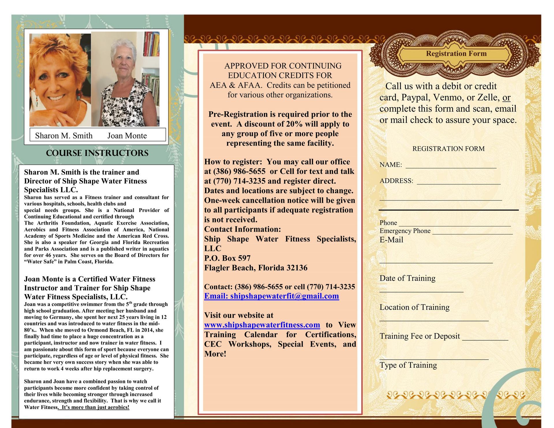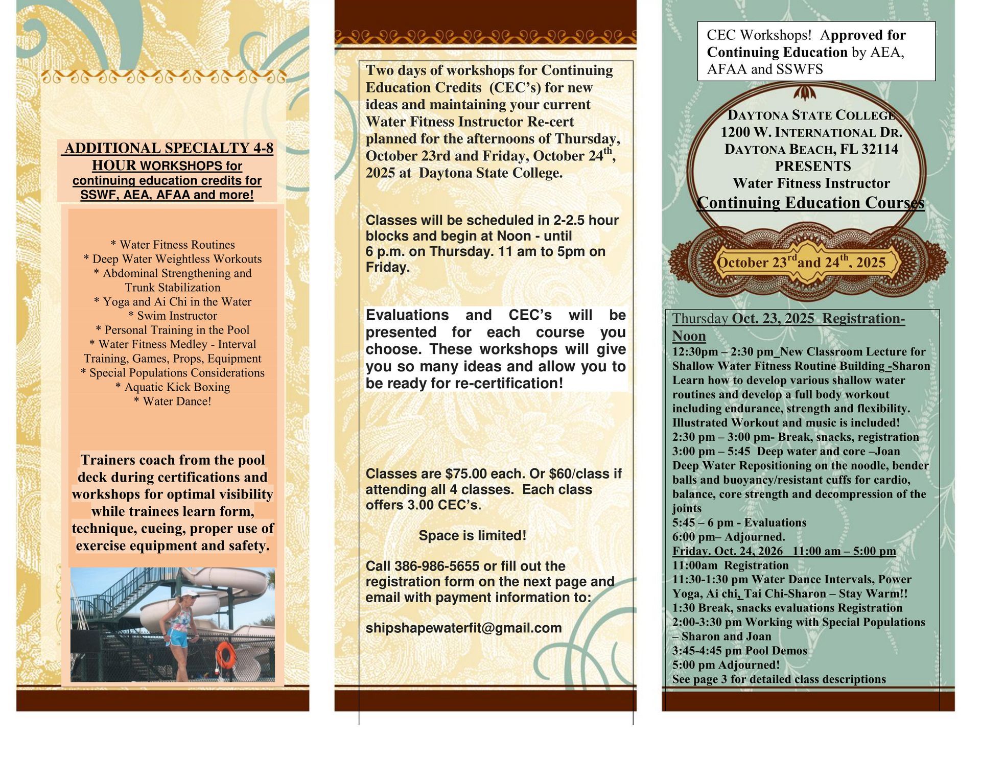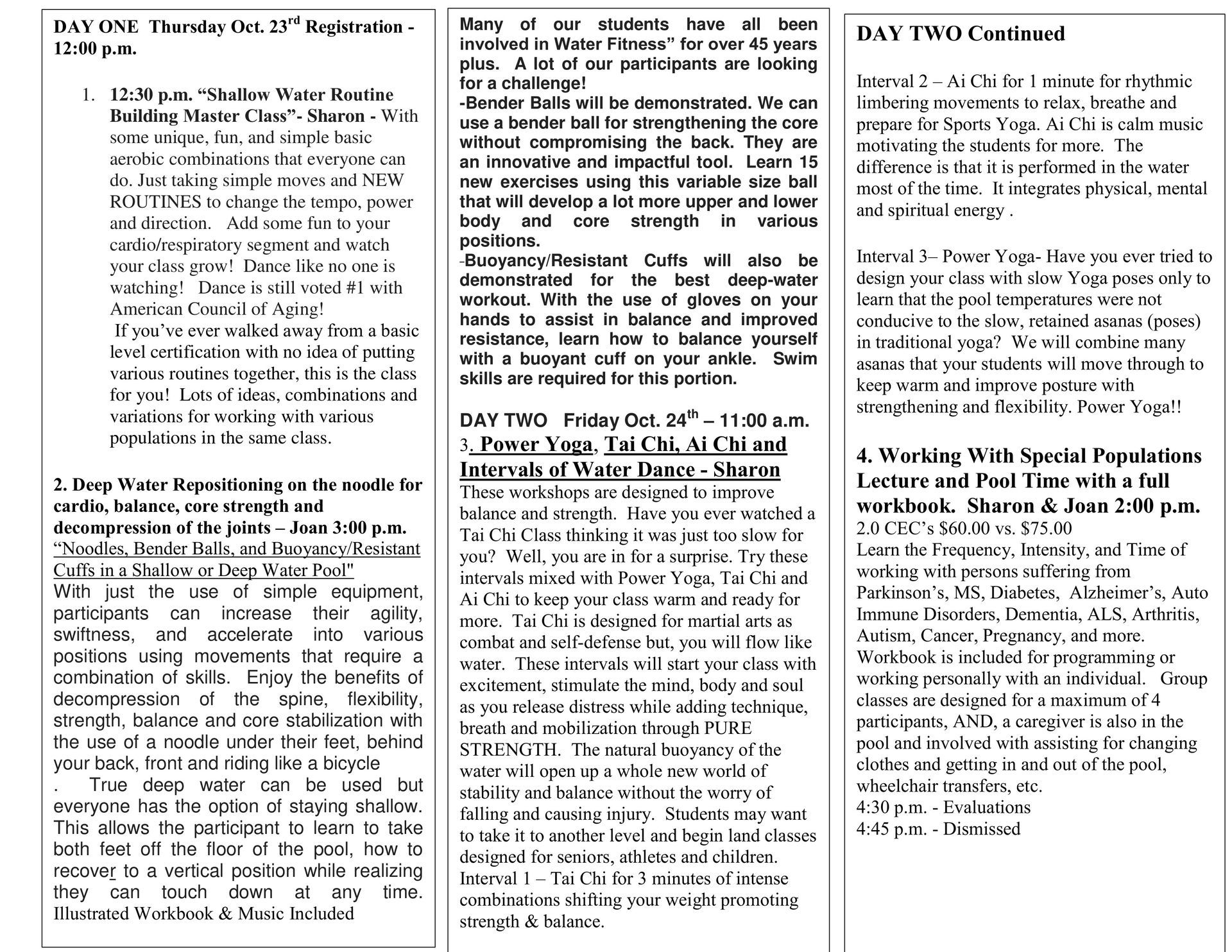 If you are currently expired, the workshops will fulfill your needs to become certified again while gaining a wealth of new ideas, current standards and guidelines as well as help you develop your own business in Personal Training if desired. If that is not your thing, come enjoy Yoga and Ai Chi, Shallow water routines, and Deepwater routines. See attached brochure.